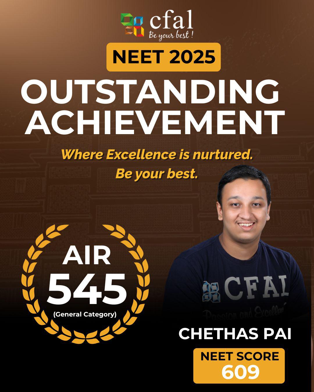 - 609/720: Chethas Pai V ranked AIR 545 (General-category), placing in the top 0.1% of over 2 million students.