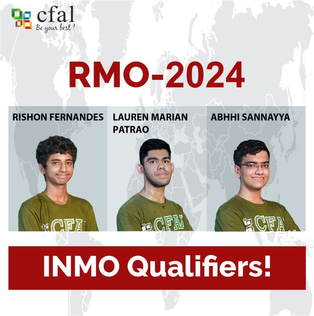 CFAL (Centre for Advanced Learning), Mangalore’s leading institute for STEM education, has reached another significant milestone in the Regional Mathematical Olympiad (RMO) 2024. Three of its students—Rishon Fernandes (57 marks), Lauren Marian Patrao (52 marks), and Abhhi Sannayya (49 marks)—have secured their spots in the prestigious Indian National Mathematical Olympiad (INMO), which will take place on January 19, 2025.